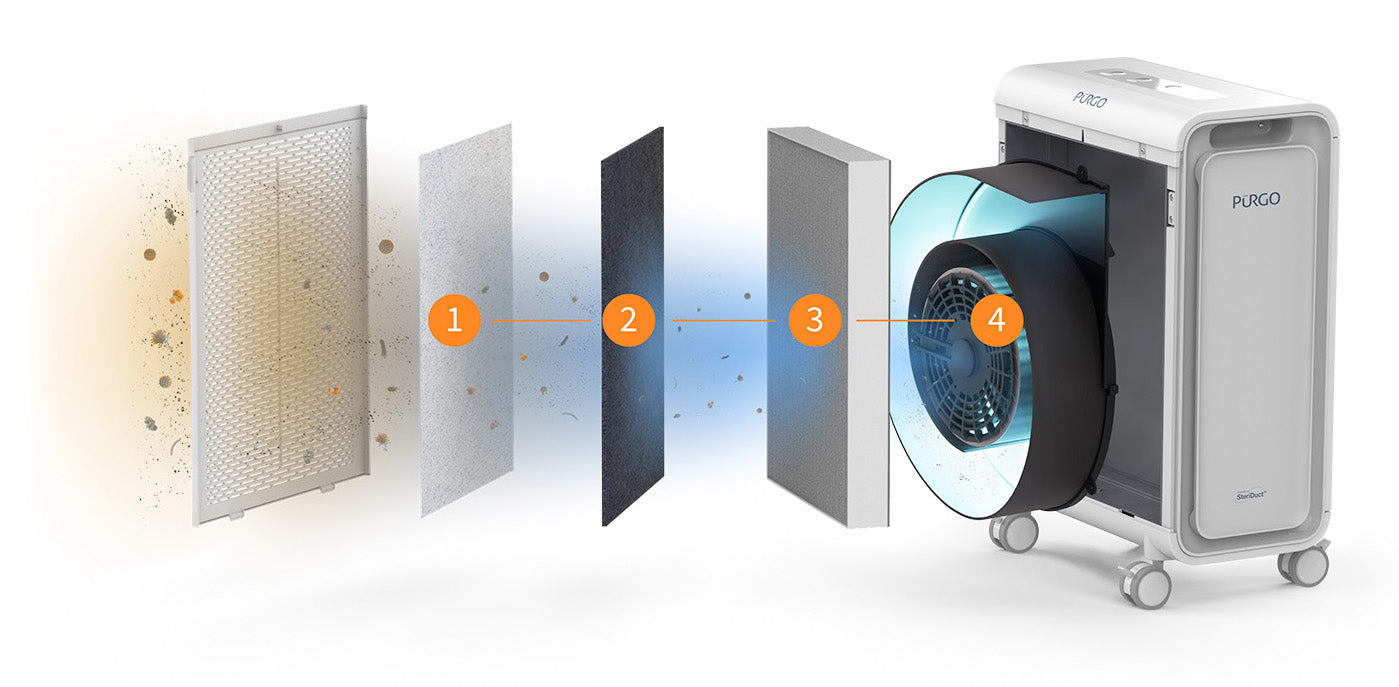 Inside every Pūrgo™ is SteriDuct™—our proprietary technology that safely maximizes UV germicidal irradiation to instantly eliminate 99.99% of harmful airborne pathogens on contact, including viruses, bacteria, fungi, pollen, and more.