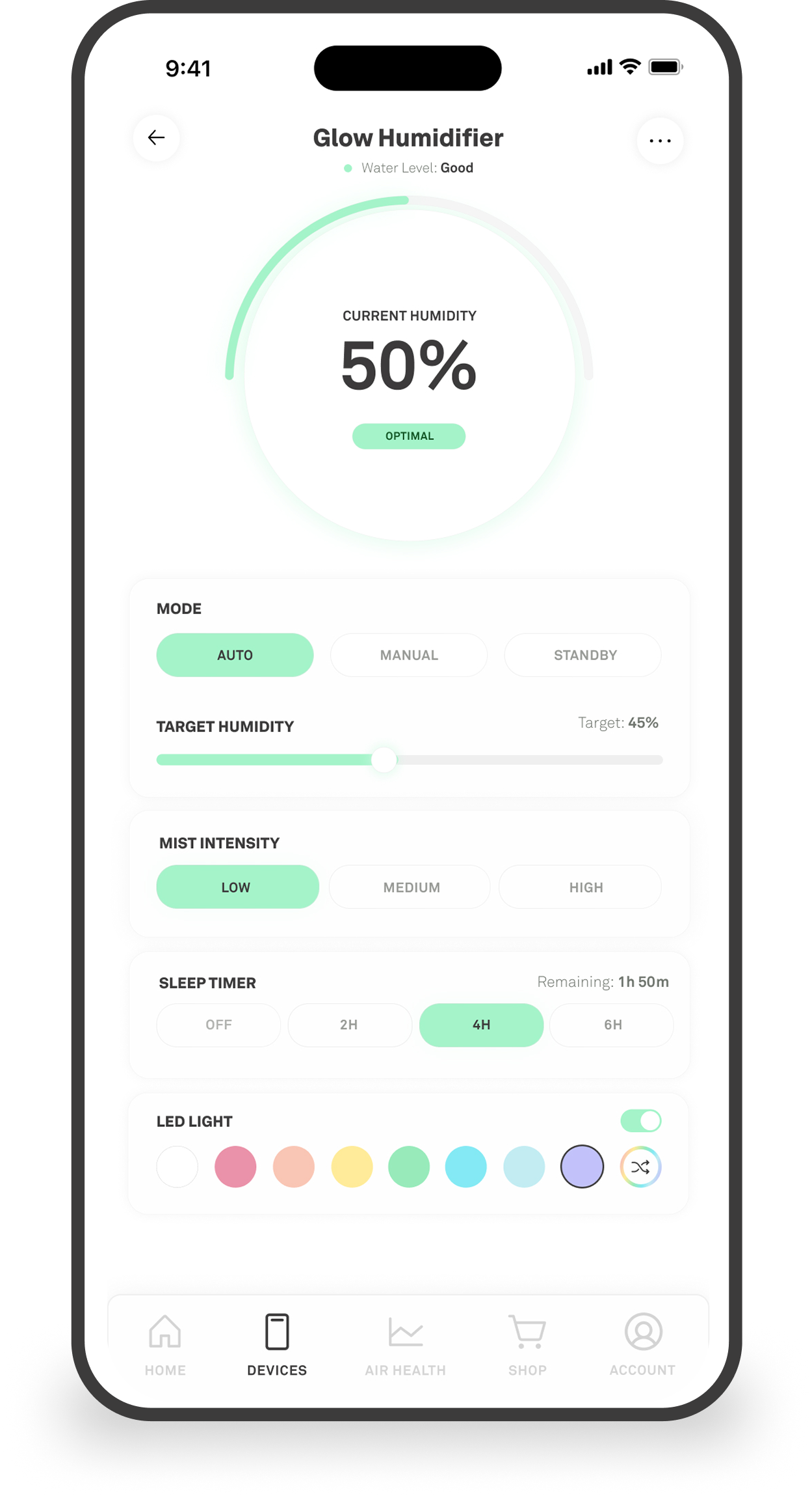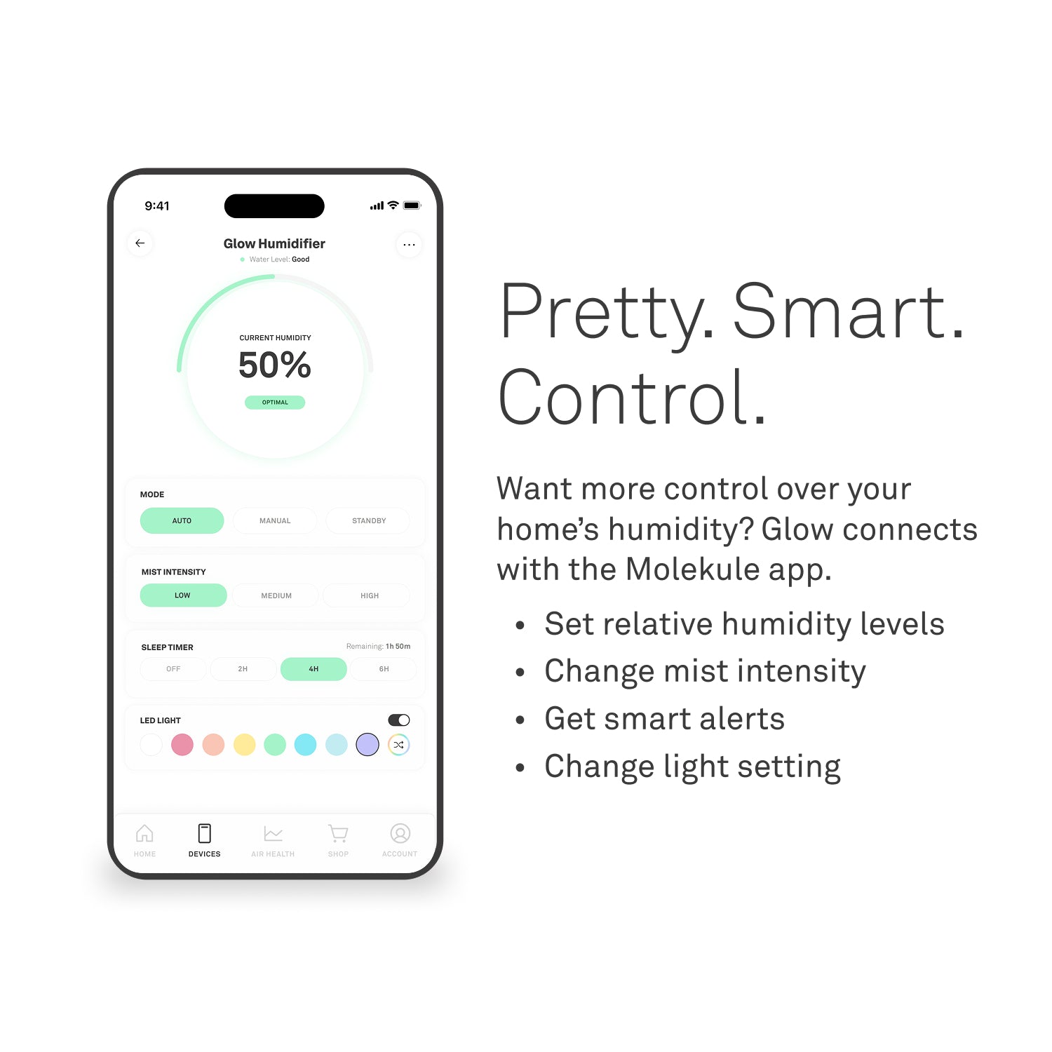 Want more control over your home’s humidity? You’ve got it. Glow connects with the Molekule app, letting you set relative humidity levels, change mist intensity, or just set to auto-mode. It’s as easy as it gets.